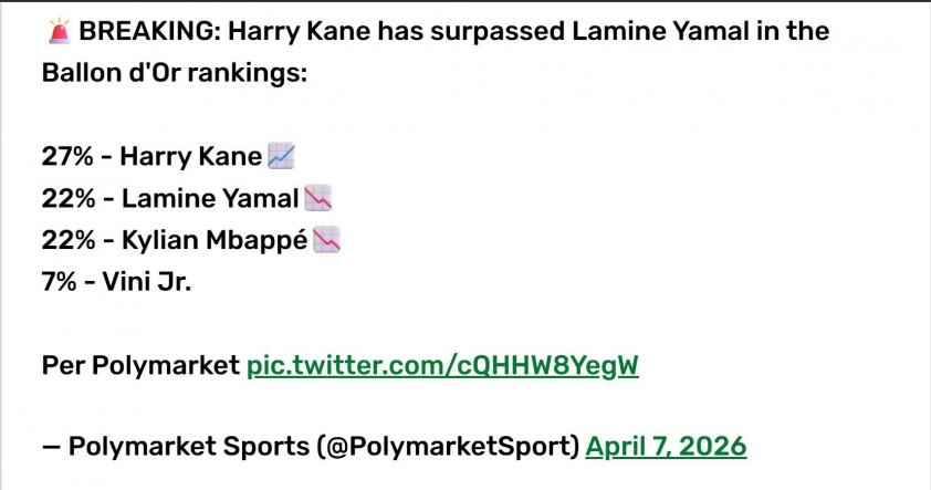 根据 Polymarket 的最新数据,凯恩目前拥有27%的几率赢得 2026年金球奖, 从而占据排行榜首位。这一突破几乎是在对阵皇家马德里的比赛后立即发生的,显示出其表现带来的强烈影响。