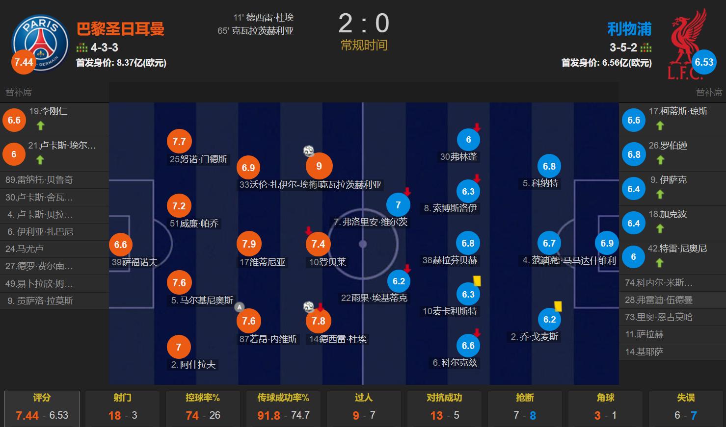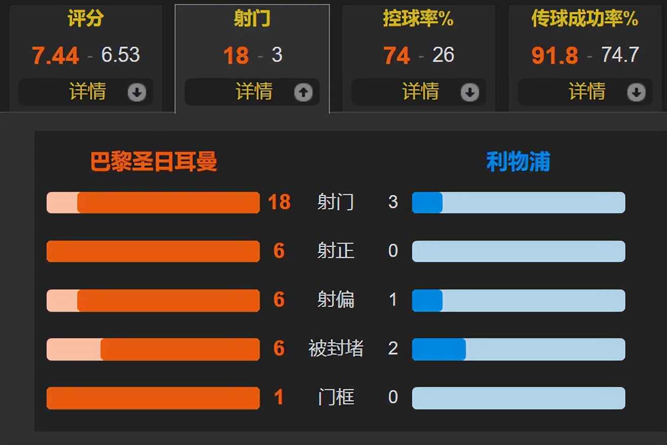 整场比赛巴黎圣日耳曼在数据上全面占优:控球率达74%,射门18次其中6次射正;利物浦控球率仅26%,全场3次射门全部偏出,创下球队近六年来欧冠首次零射正的难堪纪录。