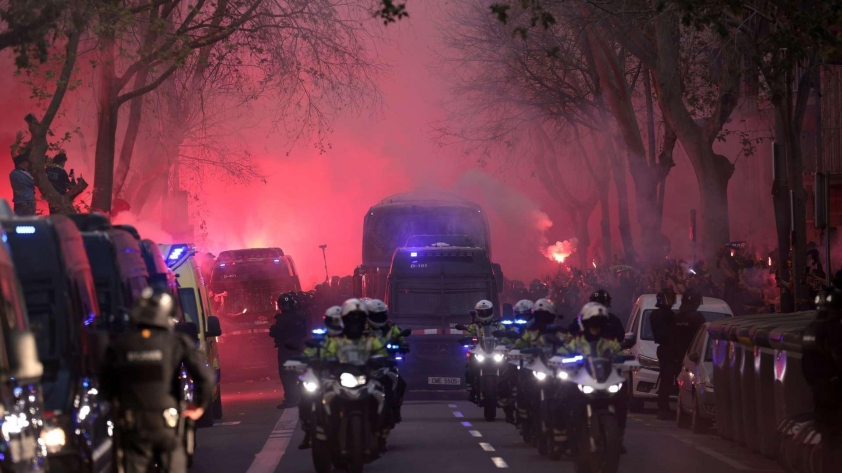 欧冠四分之一决赛首回合,巴塞罗那对阵 马德里竞技 的比赛,因场外严重事件蒙上阴影:客队大巴在开赛前遭到袭击。