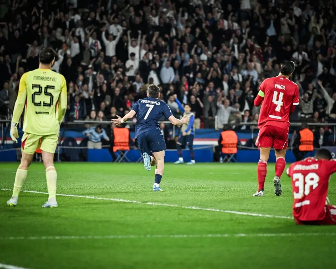 第65分钟克瓦拉茨赫利亚的进球,经历了多达27次传球,为本赛季欧冠传球次数第四多。格鲁吉亚边锋连续4场欧冠淘汰赛破门,单赛季13场欧冠9球4助攻,均为巴黎圣日耳曼队史纪录。他个人射门次数(7次)是利物浦全队(3次)的两倍有余,全场巴黎圣日耳曼射门(18比3)、射正(6比0)、控球(74%比26%)、创造机会(4比0),优势完全一边倒。