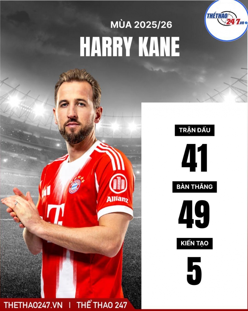 拜仁慕尼黑前锋拥有惊人的数据。他在德甲联赛打入31球,领跑欧洲金靴榜,并在所有赛事中总计贡献49球。凯恩的进球效率达到平均每60.8分钟一球——优于姆巴佩(68.2分钟)和亚马尔(91.5分钟)。不仅如此,凯恩在欧冠10场比赛中还有11球入账,在顶级舞台证明了自身实力。