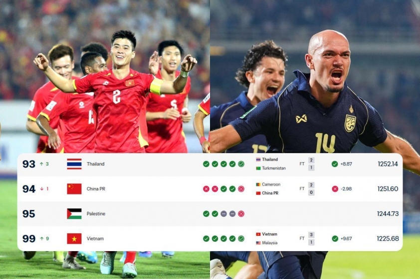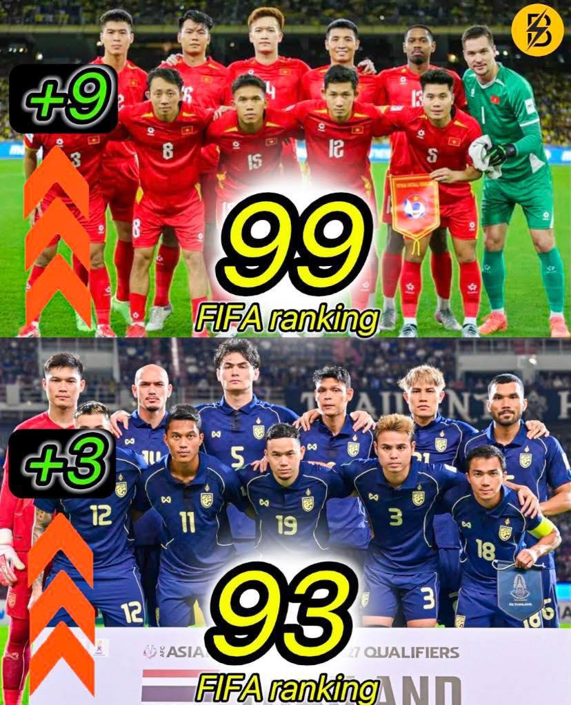泰国媒体正密切关注越南国家队在国际足联排名中的强劲攀升,其跃升9位至第99名。Thailive网站写道:激烈角逐:越南紧追泰国 除了在“东南亚世界杯”与东盟杯等赛事中争夺冠军,泰国与越南国家队还在国际足联排名榜上展开激烈竞争。国际足联积分同样是重要“奖励”,若赢得冠军,累积分数将显著增加。