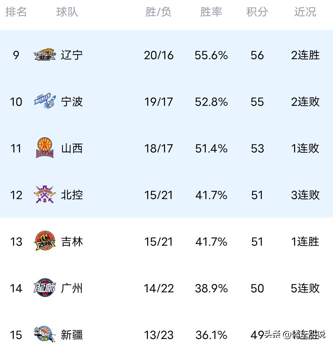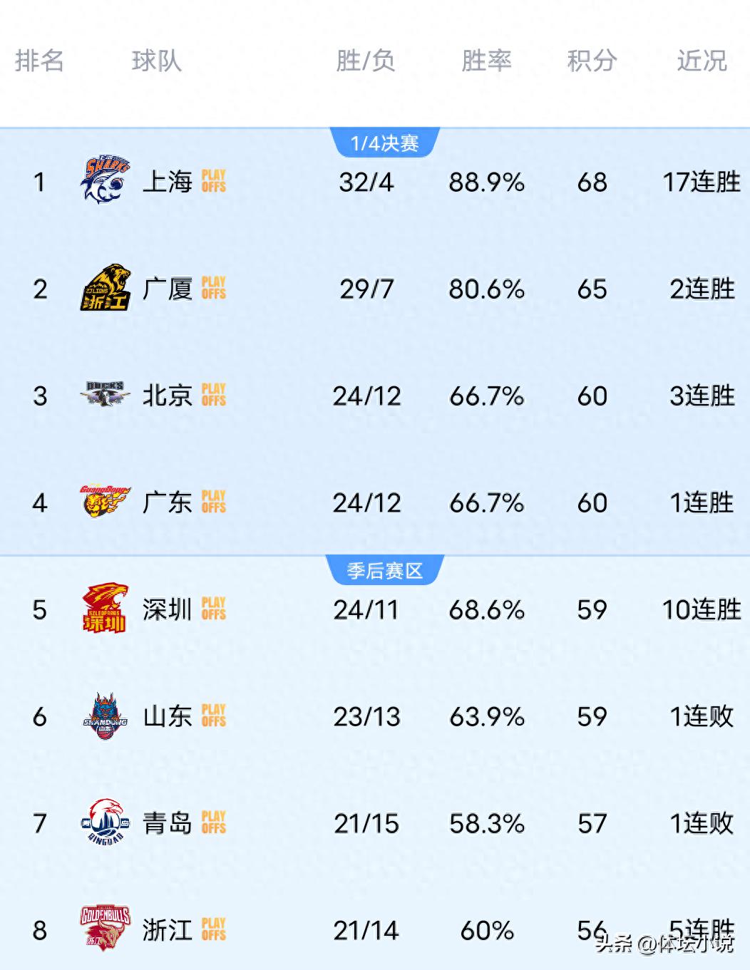 4月8日北京时间,CBA常规赛继续进行,昨晚多场比赛结束,广州队94-103惜败于强队北京队,同曦队101-92击败北控队,青岛队在加时赛中105-110被广东队大逆转,卫冕冠军广厦队103-97战胜山东队,宁波队97-119输给状态火热的领头羊上海队,新疆队在加时赛中以106-101险胜实力较弱的天津队,这样一来最新排名出炉,上海队17连胜位居第一,广厦队第二,北京队第三,广东队第四,山东队第六!