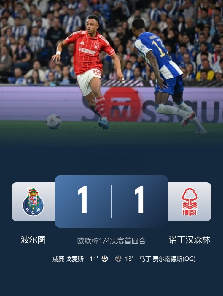 欧联杯1/4决赛首回合,波尔图主场1-1与诺丁汉森林战平!此役威廉·戈麦斯破门,马丁·费尔南德斯远距离回传误入自家球门。诺丁汉森林客场虽处劣势,但波尔图的乌龙球让其得以平局离场;次回合移师诺丁汉森林主场,其将占据晋级优势,届时凭借地利人和,有望压制葡超豪门更进一步。