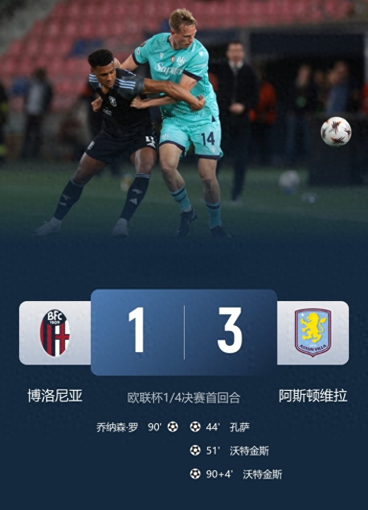 欧联杯1/4决赛首回合,阿斯顿维拉客场3-1击败博洛尼亚,已占据晋级四强的主动权!此役沃特金斯梅开二度,孔萨建功,乔纳森·罗进球却难挽败局。不得不说,由埃梅里执教的阿斯顿维拉在欧联赛场确是夺冠热门,这源于球队底蕴的自信与主帅特质的加持。英超球队征战欧联杯确实竞争力强劲,何况还有埃梅里这位欧联专家领军。阿斯顿维拉势头正盛,次回合回归主场可从容应对,晋级基本已成定局。