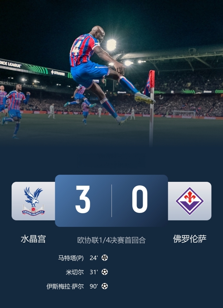 欧协杯1/4决赛首回合,水晶宫主场3-0大胜佛罗伦萨,抢占晋级四强先机;两队次回合将于4月17日凌晨3点在弗兰基球场进行,届时大抵仅是流程走过,鹰击紫百合应无悬念。此役马特塔点射得分,米切尔与萨尔双双建功。对此球迷热议:意甲欧战抽签运势亦不佳,欧联与欧协皆遇英超球队,结果差距显著!