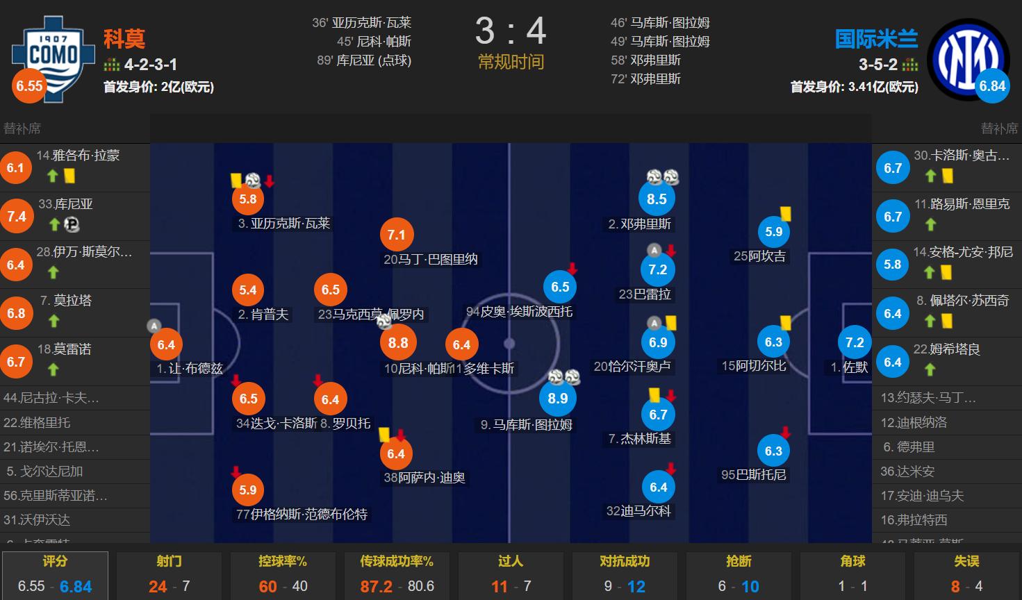 科莫对阵国际米兰,法布雷加斯采用4231阵型,杜维卡斯担任前锋,帕斯在其身后支援,迪奥与巴图里纳分居两侧,罗贝托和佩罗内组成双后腰,范德布雷普特、卡洛斯、肯普夫、瓦莱构成四后卫防线,布特兹担任门将,首发阵容总价值为2亿欧元;齐沃采用352阵型,图拉姆与埃斯波西托搭档双前锋,迪马尔科、泽林斯基、恰尔汗奥卢、巴雷拉、邓弗里斯组成五人中场,巴斯托尼、阿切尔比、阿坎吉构成三后卫防线,索默担任门将,首发阵容总价值为3.41亿欧元。