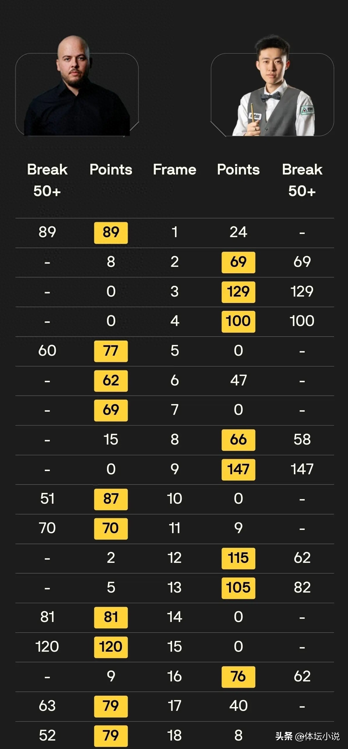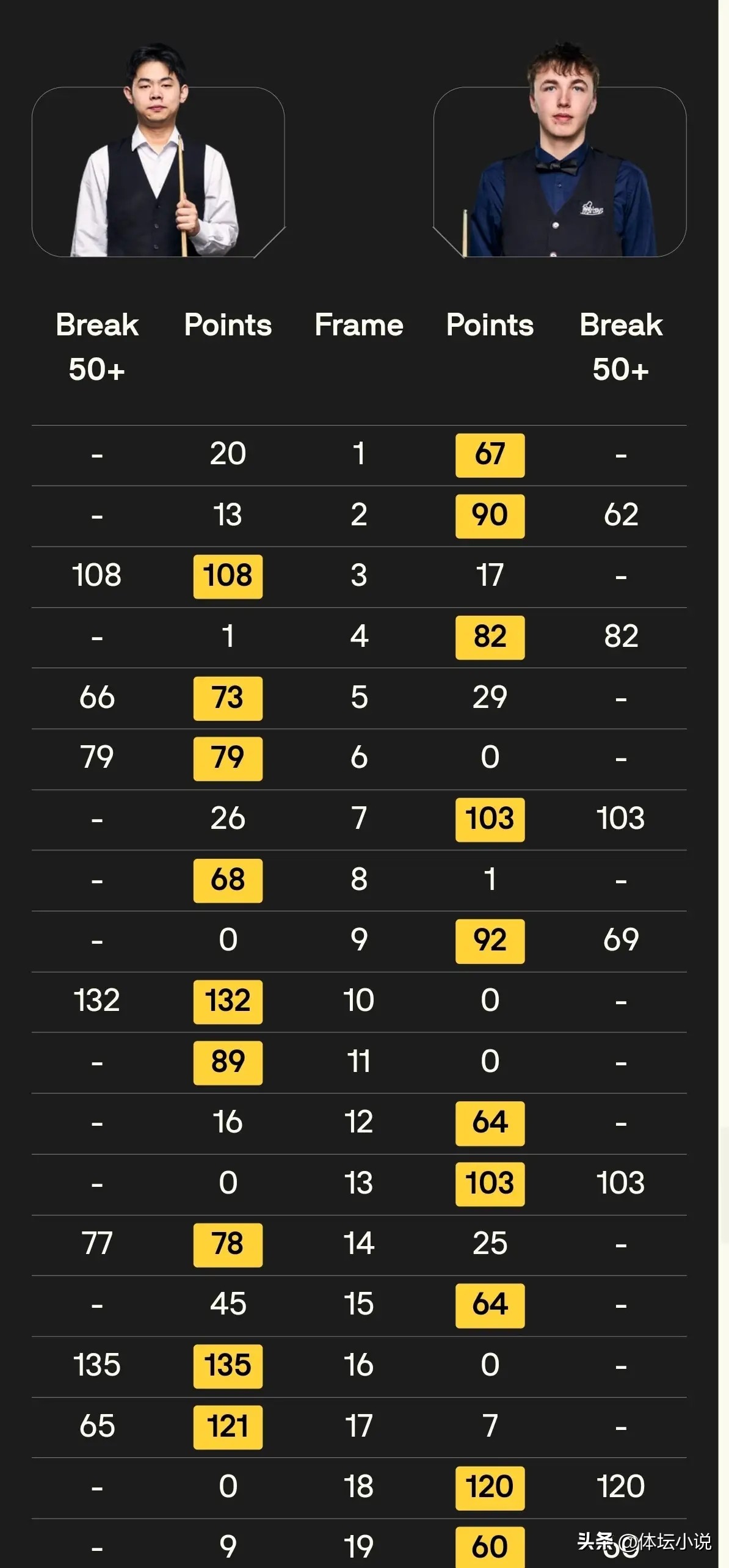 常冰玉迎战布雷切尔。布雷切尔身为世锦赛冠军,尽管近年状态不佳,但实力犹存,一旦认真应战便具备极高上限。此役双方上演进攻大战,场面大开大合,频频以一杆制胜。第一阶段常冰玉状态略胜一筹,轰出三杆破百及两杆50+,以5-4领先布雷切尔。第二阶段两人继续对攻,各取两局,常冰玉一度以7-6占优。随后比赛却呈现一边倒态势,布雷切尔准度惊人,打出闪电般的4-1攻势,最终以10-8击败常冰玉晋级第四轮。此结果虽属正常,但常冰玉在四大赛中两度打出147满分杆并收获高额奖金,亦可谓有所收获!