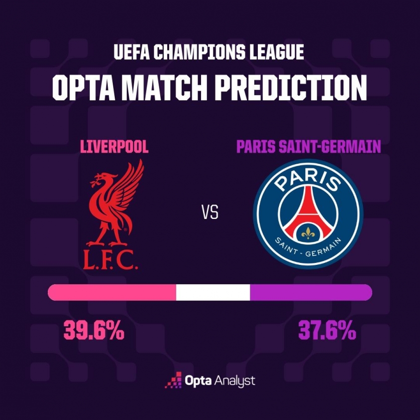 Opta超级计算机显示利物浦与巴黎圣日耳曼几乎势均力敌,然而先手优势让法国球队在客场回合前握有显著主动权。