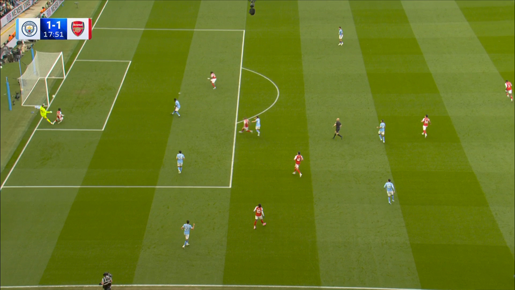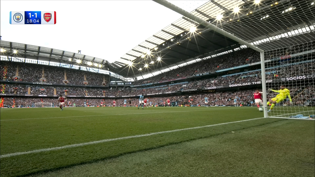 接到队友掷回的界外球,多纳鲁马处理迟缓,而凯·哈弗茨迅速逼近。曼城门将的解围球击中哈弗茨腿部后弹入自家网内,助阿森纳将比分扳平为1-1。