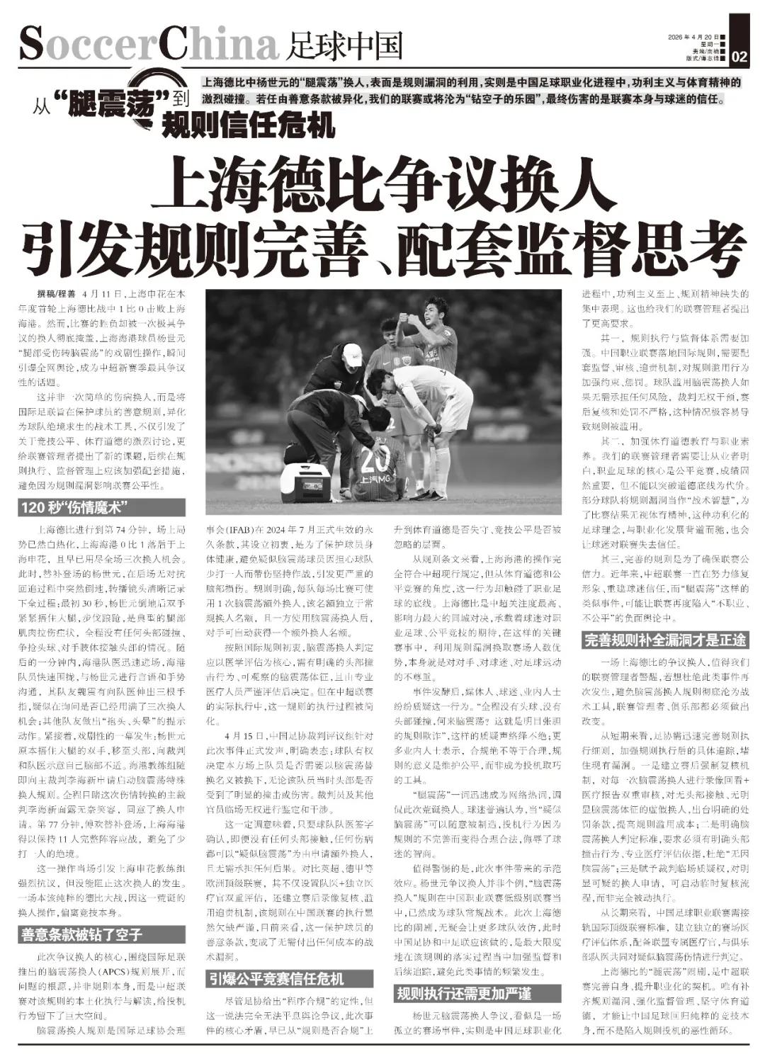 一场上海德比的争议换人,值得联赛管理者警醒,若想杜绝此类事件再次发生,避免脑震荡换人规则彻底沦为战术工具,联赛管理者与俱乐部都必须做出改变。