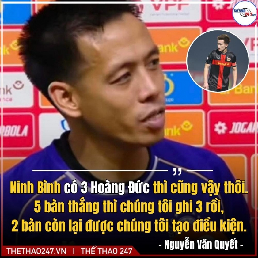 赛后,文决的发言也引起了广泛关注。他认为宁平队缺少阮黄德并非导致失败的原因,甚至断言:“就算有三个黄德,结果也一样。”文决也直言对手偏向长传的打法并非真正的足球,同时强调河内FC凭借令人信服的表现理应赢得这场胜利。