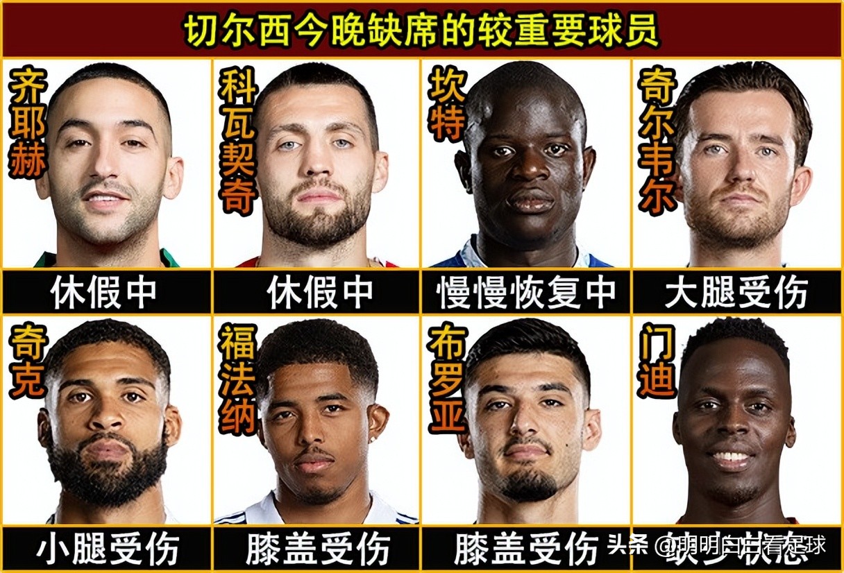 坎特、齐耶赫、奇克、7252都缺阵……切尔西至少有七名主力球员无法上场。