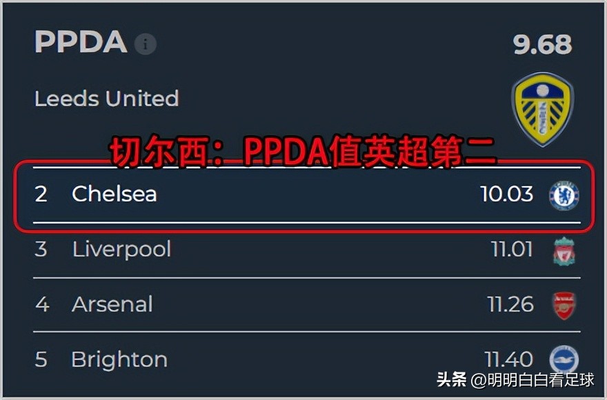 下图展示了英超PPDA值排名前五,数值越低代表逼抢越紧密。